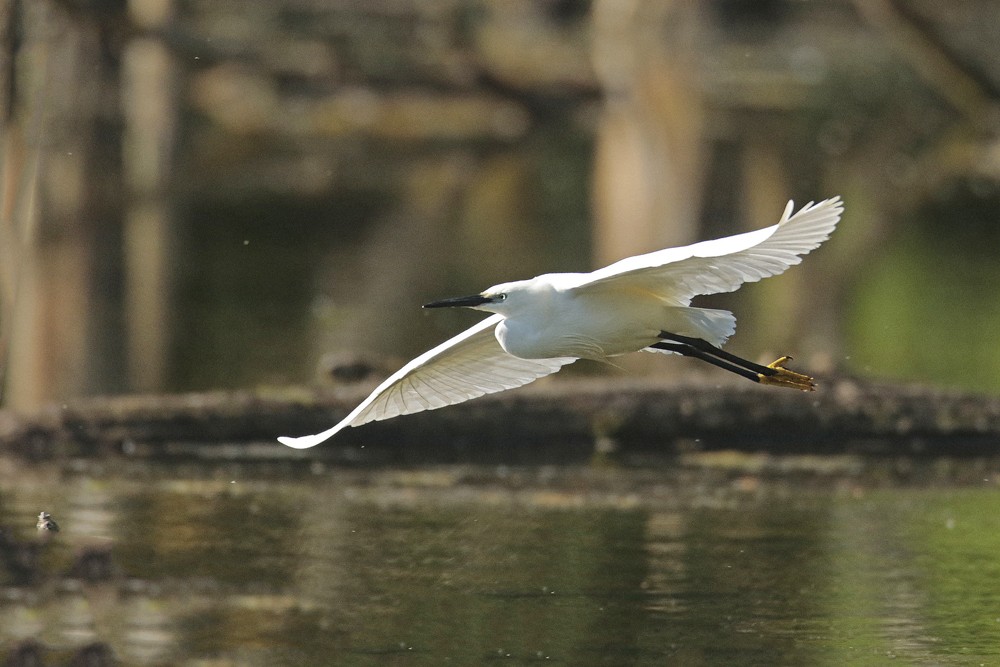 En vol on remarque ses pieds jaunes et son bec noir qui la distingue de la grande aigrette